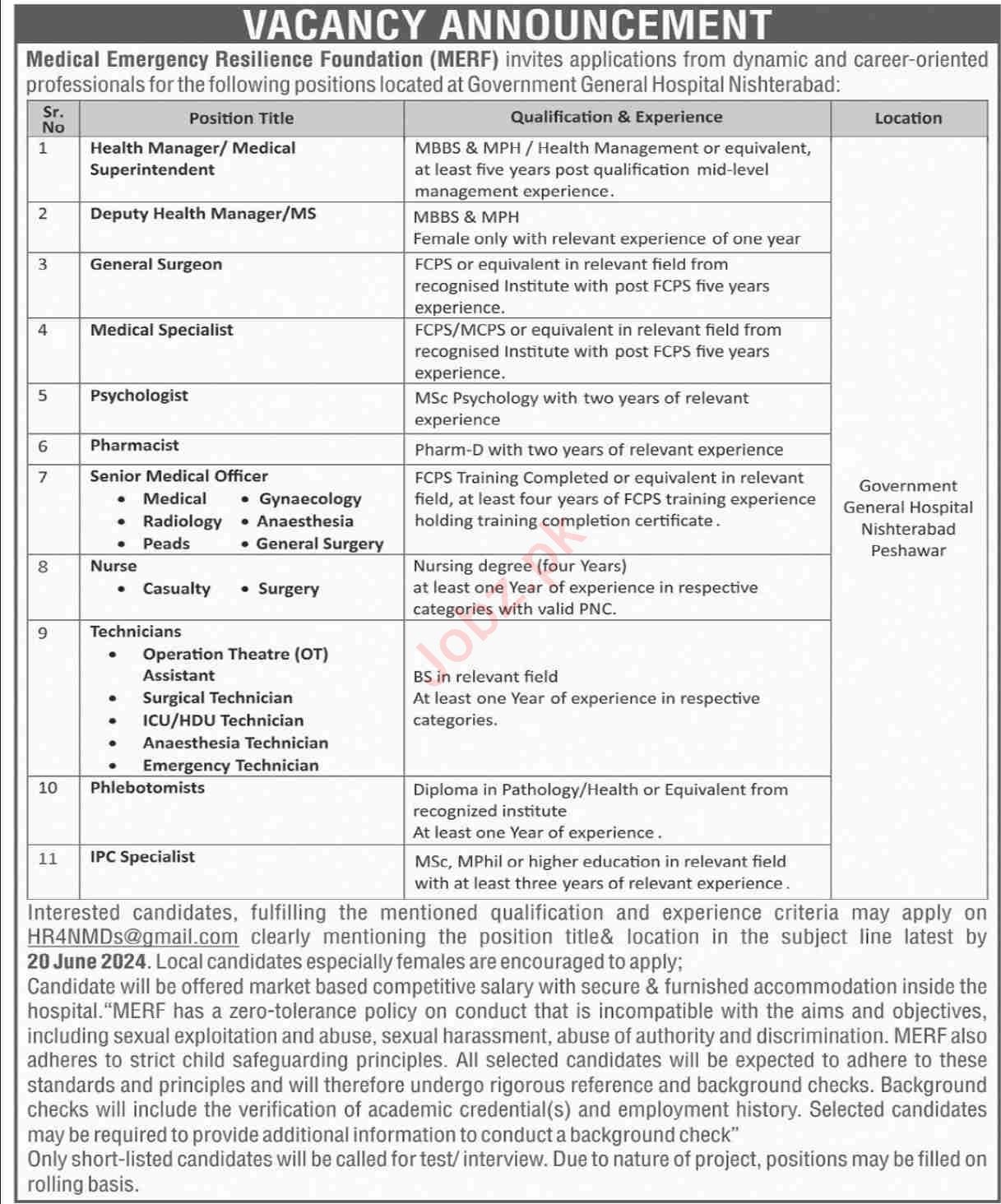 Latest Medical Emergency Resilience Foundation MERF Management Posts Peshawar 2025