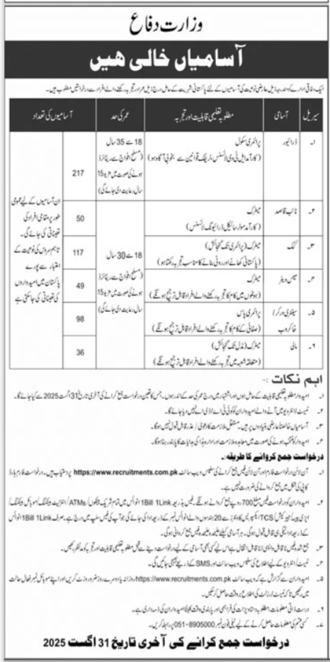 Ministry of Defence jobs advertisement dated about 10 August 2025 in daily Jang Newspaper invites application for the vacant post of mess waiter, naib qasid, driver, mali, khakrob, cook and sanitary worker in Islamabad, islamabad Islamabad Pakistan. Preferred Education is Primary, Middle and Matric etc.