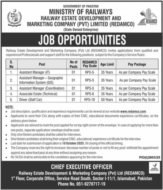 Ministry of Railways jobs advertisement dated about 29 September 2025 in daily Jang Newspaper invites application for the vacant post of Associate Estate Technical, Assistant Manager Coordination, Driver, Assistant Manager Gis and Assistant Manager It in I-11/1 Islamabad, islamabad Islamabad Pakistan. Preferred Education is Master, Matric, Intermediate and Bachelor etc.