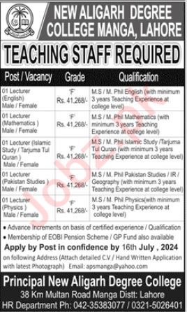 Aligarh College invites applications for job positions advertised in daily Jang dated 7 July 2024 for following vacancies in Lahore, lahore Punjab Pakistan.