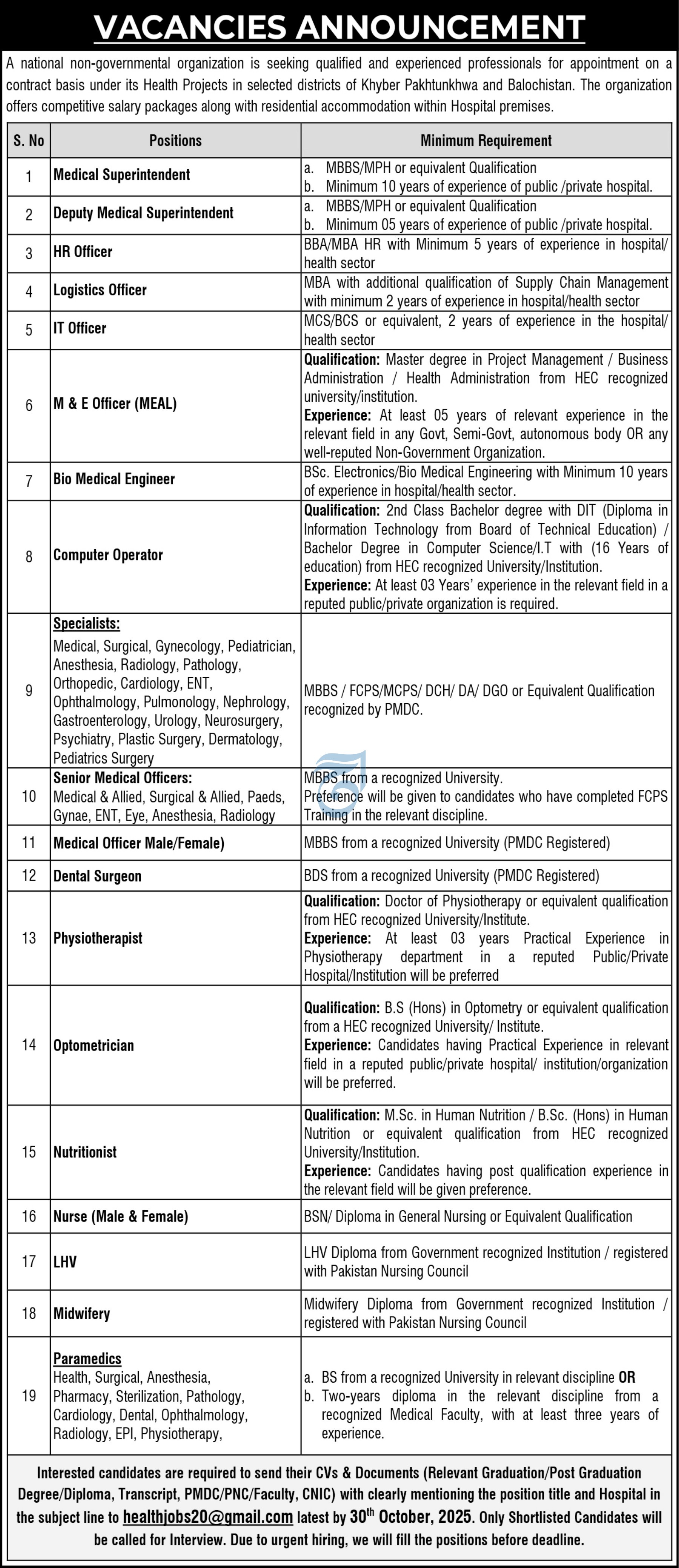 Vacant posts including Me Officer, Medical Superintendent, Medical Officer, Hr Officer, Bio Medical Engineer, Optometrician, Nutritionist, Paramedics, Specialist, It Officer, Dental Surgeon, Deputy Medical Superintendent, Midwifery, Physiotherapist, Logistics Officer, Computer Operator and Nurse are announced in Non Governmental Organization NGO Peshawar, peshawar Khyber Pakhtunkhwa KPK Pakistan as per 5 October 2025 advertisement in daily Aaj Newspaper. Intermediate, Bachelor and MBBS etc. educational qualification will be preferred.