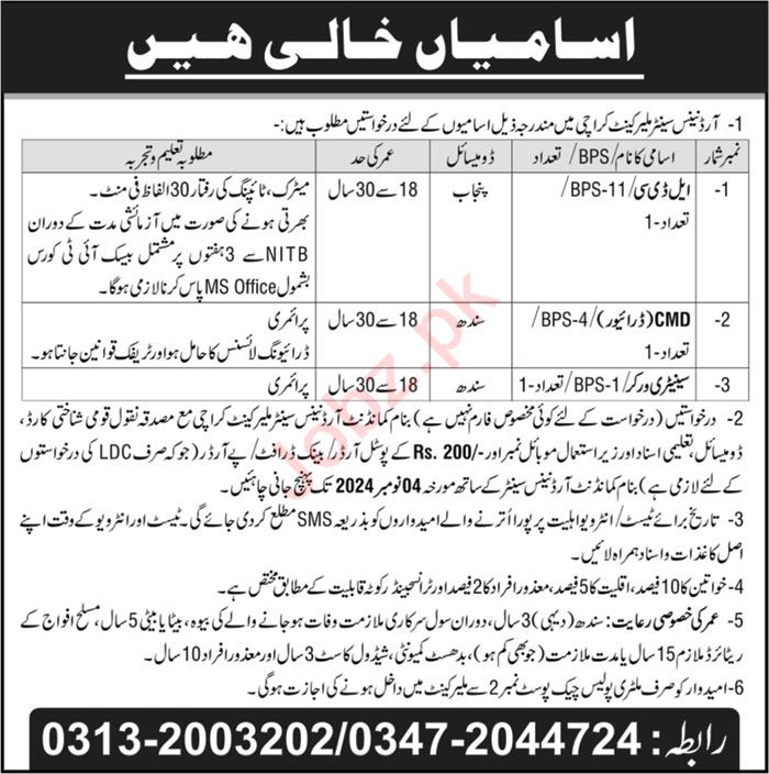 Vacant posts including ldc, cmd driver and sanitary worker are announced in Ordnance Center Karachi, karachi Sindh Pakistan as per 20 October 2024 advertisement in daily Roznama 92 News Newspaper. Educational qualifications required Primary and Matric etc.