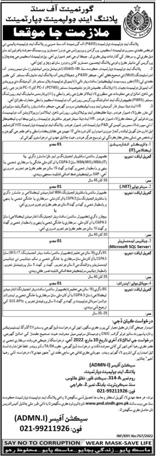 Planning and Development Department is looking for candidates for following posts as per job advertisement published in daily Kawish Newspaper of February 22, 2022 for location Karachi, karachi Sindh Pakistan:
