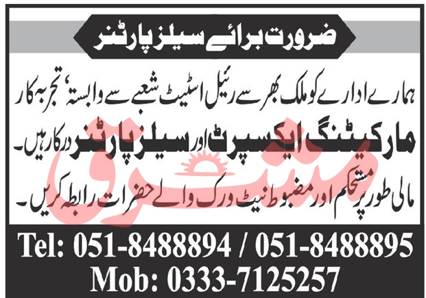 Vacant posts including marketing expert and sales partner are announced in Private Organization Islamabad, islamabad Islamabad Pakistan as per 15 January 2024 advertisement in daily Mashriq Newspaper. Preferred Education is Master and Bachelor etc.