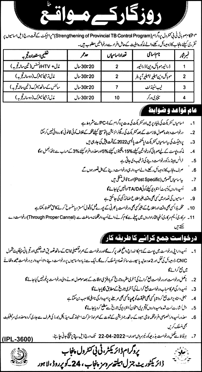 Vacant posts including lab attendant, sanitary worker, mobile van helper, helper operator and mobile van driver are announced in Provincial TB Control Program Lahore, lahore Punjab Pakistan as per 7 April 2022 advertisement in daily Nawaiwaqt Newspaper. Matric and Middle etc. educational qualification will be preferred.