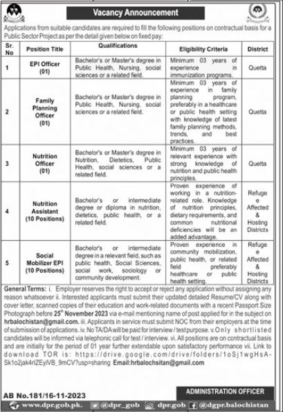 Public Sector Project Quetta, quetta Balochistan Pakistan invites applications from eligible candidates for the post of nutrition officer, social mobilizer epi, family planning officer, epi officer and nutrition assistant as per advertisement of November 17, 2023 published in daily Jang Newspaper. Persons with Bachelor, Master and Intermediate etc. education can apply.
