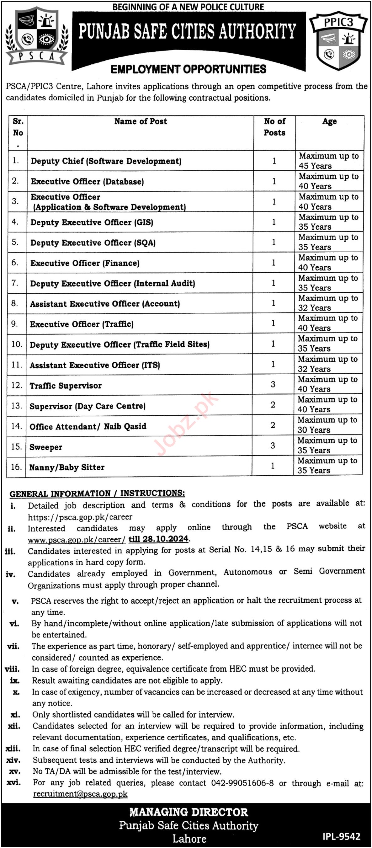 Vacant posts including Sweeper, Executive Officer Finance, Office Attendant, Naib Qasid, Deputy Chief Software Development, Deputy Executive Officer Internal Audit, Deputy Executive Officer Sqa, Deputy Executive Officer Traffic Field Sites, Assistant Executiv Officer Account, Traffic Supervisor, Executive Officer Application Software Development, Supervisor Day Care Centre, Nanny, Executive Officer Traffic, Assistant Executive Officer Its, Executive Officer Database, Baby Sitter and Deputy Executive Officer Gis are announced in Punjab Safe Cities Authority PSCA Lahore, lahore Punjab Pakistan as per 13 October 2024 advertisement in daily Express Tribune Newspaper. Persons with Bachelor, Intermediate, Middle, Master and Primary etc. education can apply.