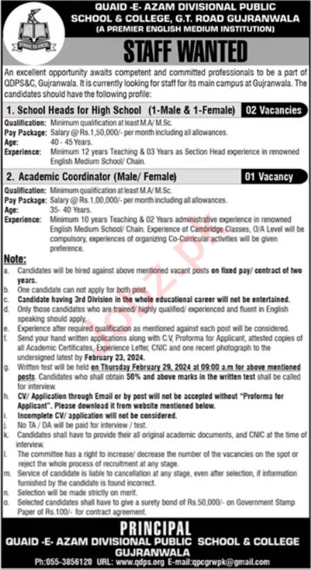 Quaid e Azam Divisional Public School & College is looking for candidates for following posts as per job advertisement published in daily Dunya Newspaper of February 18, 2024 for location Gujranwala, gujranwala Punjab Pakistan: