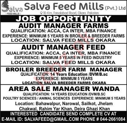 Salva Feed Mills jobs advertisement dated about 25 December 2022 in daily Express Newspaper invites application for the vacant post of broiler breeder farm manager, area sale manager wanda, audit manager farms and audit manager feed in Okara, jhelum, narowal, bahawalpur, sialkot, rahim yar khan, chakwal, okara and dera ghazi khan Punjab Pakistan. ACCA, Bachelor, CA, MBA and Master etc. educational qualification will be preferred.
