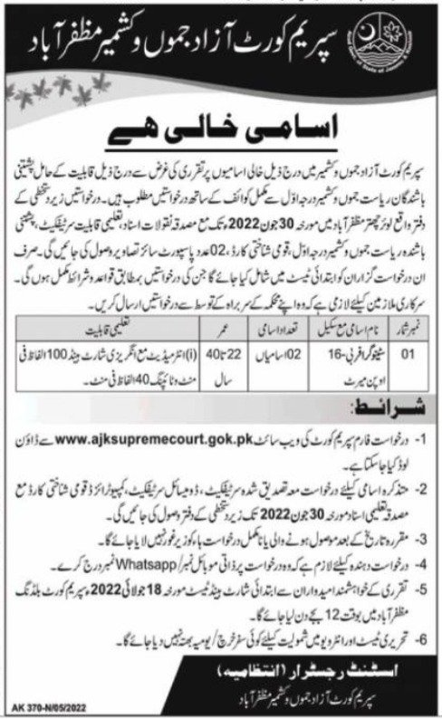 Vacant posts including stenographer are announced in Supreme Court of Azad Jammu & Kashmir Muzaffarabad, muzaffarabad AJK Pakistan as per 2 June 2022 advertisement in daily Nawaiwaqt Newspaper. Candidates with Intermediate etc. educational background will be preferred.