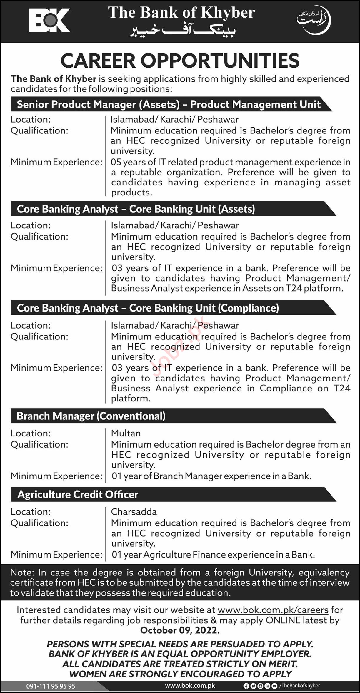 Vacant posts including agriculture credit officer, product manager, core banking analyst and branch manager conventional are announced in The Bank of Khyber BOK Islamabad, karachi, peshawar, charsadda, islamabad and multan Islamabad Pakistan as per 25 September 2022 advertisement in daily Nation Newspaper. Bachelor and Master etc. educational qualification will be preferred.