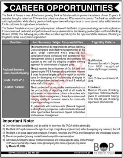The Bank of Punjab BOP jobs advertisement dated about 17 March 2024 in daily Jang Newspaper invites application for the vacant post of regional business head in Karachi, karachi Sindh Pakistan. Bachelor etc. educational qualification will be preferred.