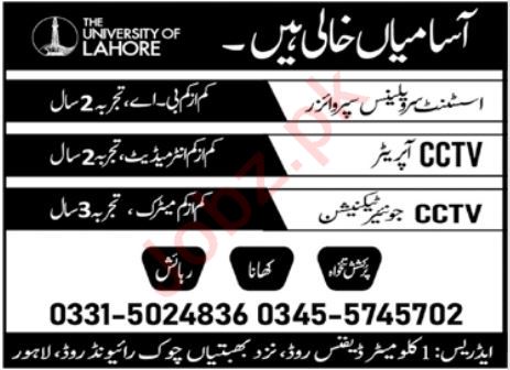 Vacant posts including assistant surveillance supervisor, cctv operator and cctv technician are announced in The University of Lahore Lahore, lahore Punjab Pakistan as per 15 May 2022 advertisement in daily Jang Newspaper. Intermediate, Matric and BA etc. educational qualification will be preferred.