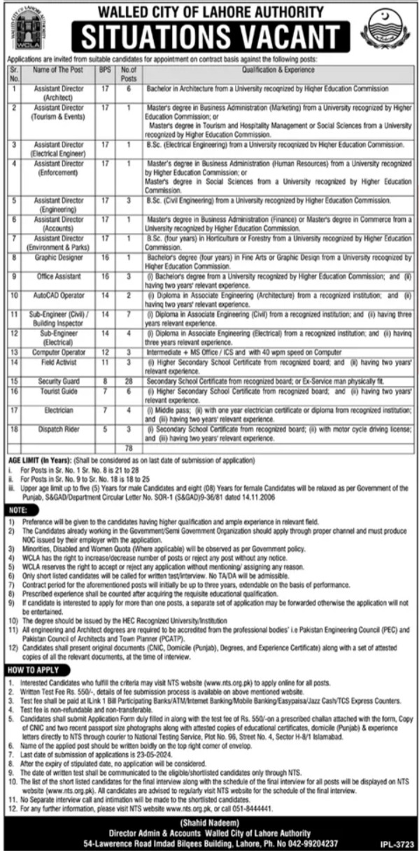 Vacancies in Walled City of Lahore Authority Advertisement May 2024