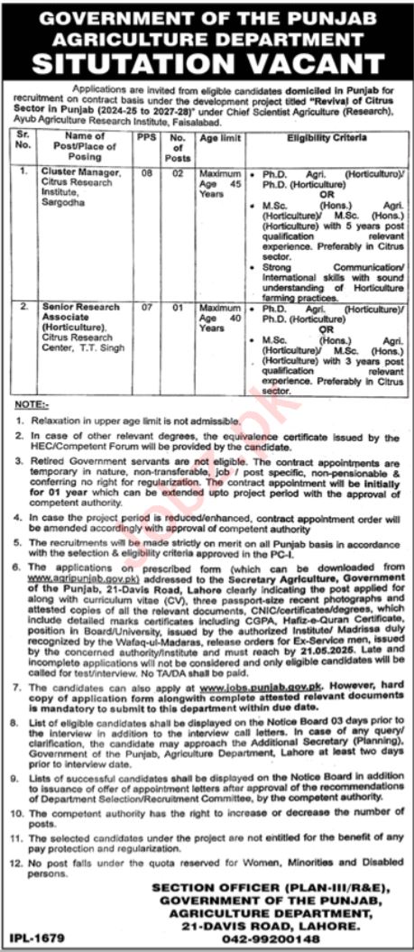 Agriculture Department jobs advertisement dated about 4 May 2025 in daily Jang Newspaper invites application for the vacant post of cluster manager and sr research associate in Davis Road Lahore, lahore Punjab Pakistan. Candidates with M.sc and Phd etc. educational background will be preferred.