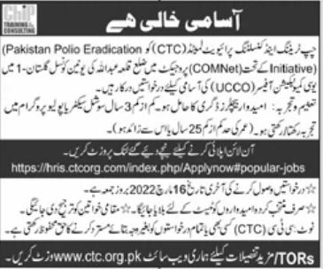 CHIP Training & Consulting Pvt Ltd Killa Abdullah, killa abdullah Balochistan Pakistan invites applications from eligible candidates for the post of uc communication officer ucco as per advertisement of March 9, 2022 published in daily Jang Newspaper. Bachelor etc. educational qualification will be preferred.