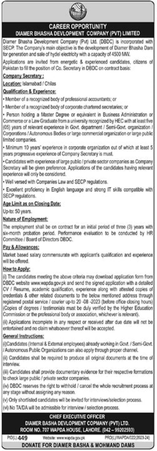 Apply at Water and Power Development Authority WAPDA latest Government jobs in Secretarial and departments before closing date which is around August 20, 2023 or as per closing date in newspaper ad. Read complete ad online to know how to apply on latest Water and Power Development Authority WAPDA job opportunities.