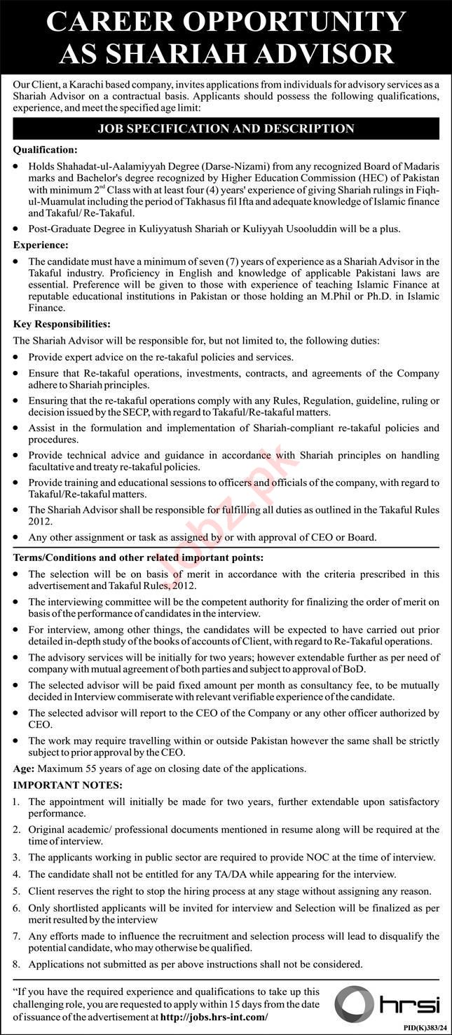 Vacant posts including shariah advisor are announced in Human Resource Solution International HRSI Karachi, karachi Sindh Pakistan as per 11 August 2024 advertisement in daily Express Newspaper. Preferred Education is Bachelor and Master etc.