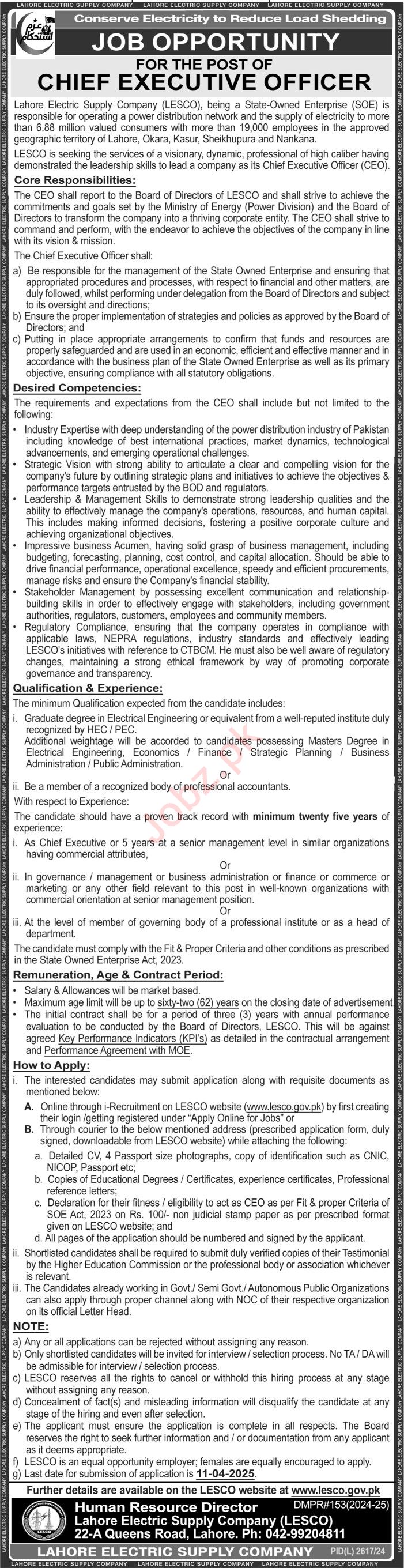 Vacant posts including chief executive officer are announced in Lahore Electric Supply Company LESCO Queens Road Lahore, lahore Punjab Pakistan as per 23 March 2025 advertisement in daily Other Newspaper. Persons with Bachelor and Master etc. education can apply.
