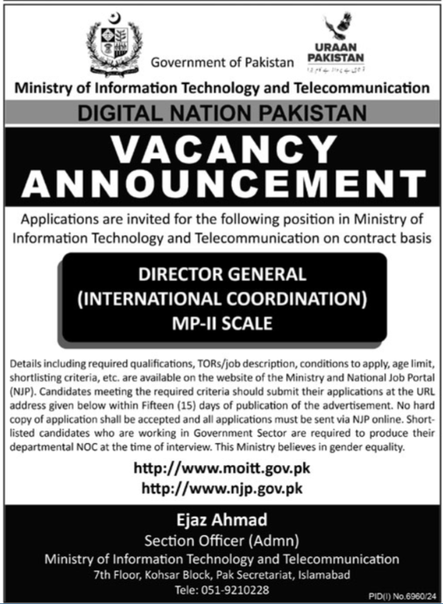 Ministry of Information Technology & Telecommunication MOIT jobs advertisement dated about 13 April 2025 in daily Ausaf Newspaper invites application for the vacant post of director general in Islamabad, islamabad Islamabad Pakistan. Candidates with Master and Bachelor etc. educational background will be preferred.
