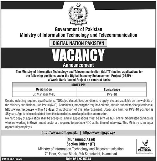 Vacant posts including manager me are announced in Ministry of Information Technology & Telecommunication MOIT Islamabad, islamabad Islamabad Pakistan as per 7 December 2025 advertisement in daily The News Newspaper. Master and Bachelor etc. educational qualification will be preferred.