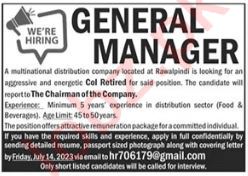 Multinational Distribution Company Rawalpindi, rawalpindi Punjab Pakistan invites applications from eligible candidates for the post of general manager as per advertisement of June 25, 2023 published in daily The News Newspaper. Educational qualifications required Bachelor and Master etc.