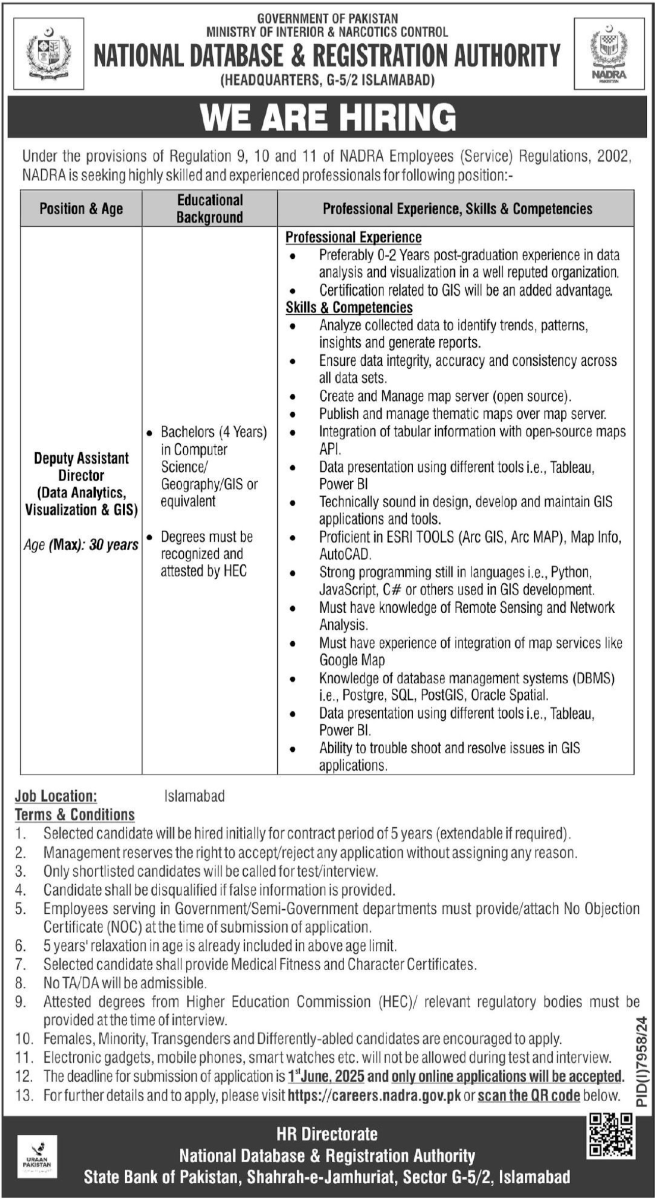 National Database & Registration Authority NADRA G-5 Islamabad, islamabad Islamabad Pakistan invites applications from eligible candidates for the post of deputy assistant director as per advertisement of May 18, 2025 published in daily Express Tribune Newspaper. Educational qualifications required Bachelor and Master etc.