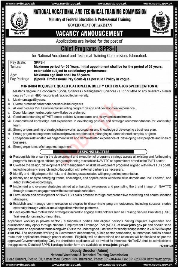 National Vocational and Technical Training Commission Islamabad, islamabad Islamabad Pakistan invites applications from eligible candidates for the post of chief programs as per advertisement of July 7, 2024 published in daily Express Tribune Newspaper. Candidates with Master etc. educational background will be preferred.