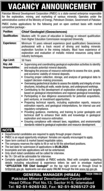 Vacant posts including chief geologist are announced in Pakistan Mineral Development Corporation Islamabad, islamabad Islamabad Pakistan as per 20 May 2024 advertisement in daily Jang Newspaper. Preferred Education is Master etc.