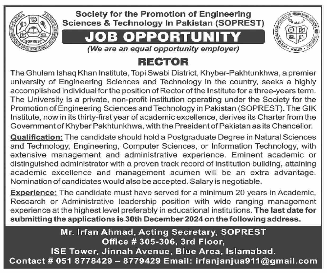 Society for the Promotion of Engineering Sciences & Technology SOPREST is looking for candidates for following posts as per job advertisement published in daily Dawn Newspaper of December 11, 2024 for location Swabi, swabi Khyber Pakhtunkhwa KPK Pakistan: