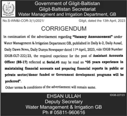 Water Management and Irrigation Department invites applications for job positions advertised in daily Dunya dated 14 April 2023 for following vacancies in Gilgit, gilgit Gilgit Baltistan Pakistan.