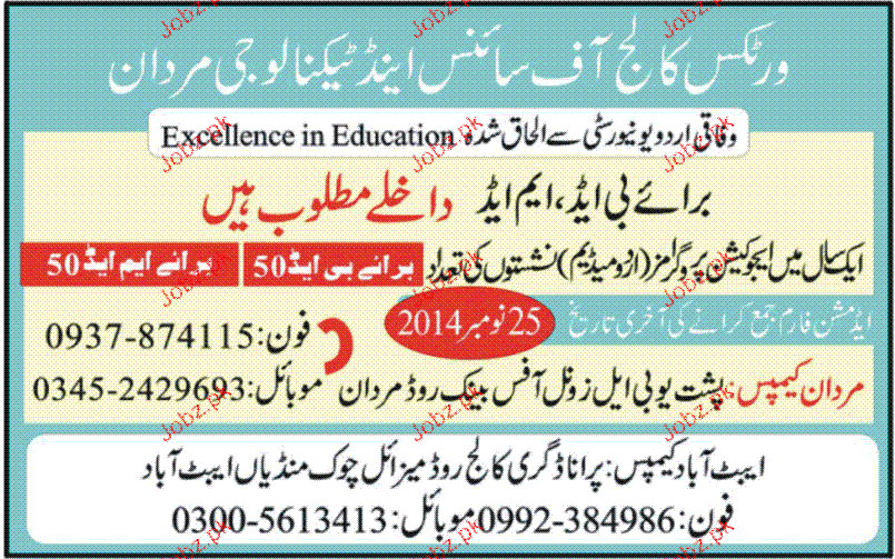 Vertex College of Science and Technology Admission in B.ed and M.ed in Mardan. Read newspaper ad for exact details.