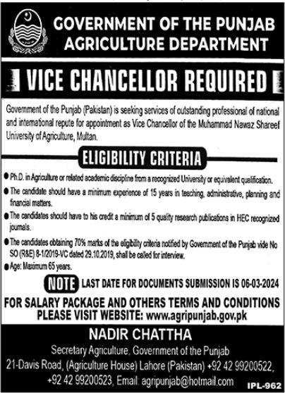 Agriculture Department jobs advertisement dated about 30 January 2024 in daily Jang Newspaper invites application for the vacant post of vice chancellor in Multan, multan Punjab Pakistan. Preferred Education is Phd etc.