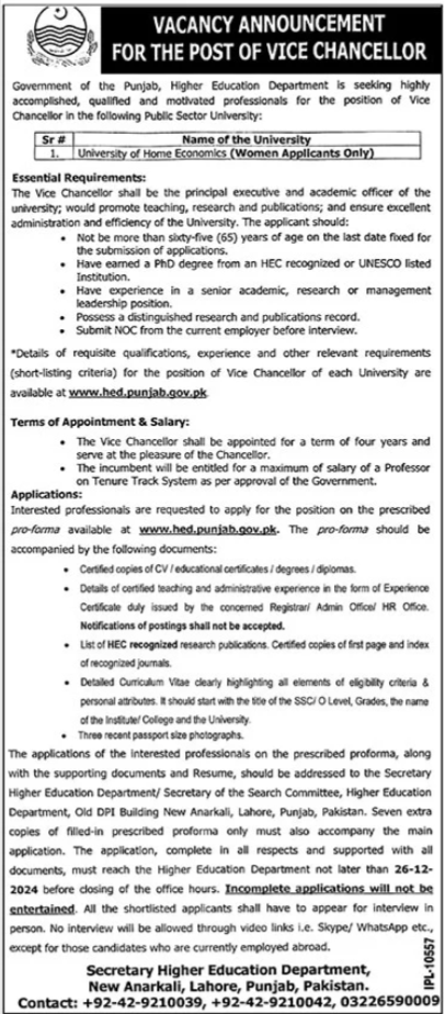 University of Home Economics UHE, Higher Education Department Lahore, lahore Punjab Pakistan invites applications from eligible candidates for the post of vice chancellor as per advertisement of December 12, 2024 published in daily The News Newspaper. Preferred Education is Phd etc.