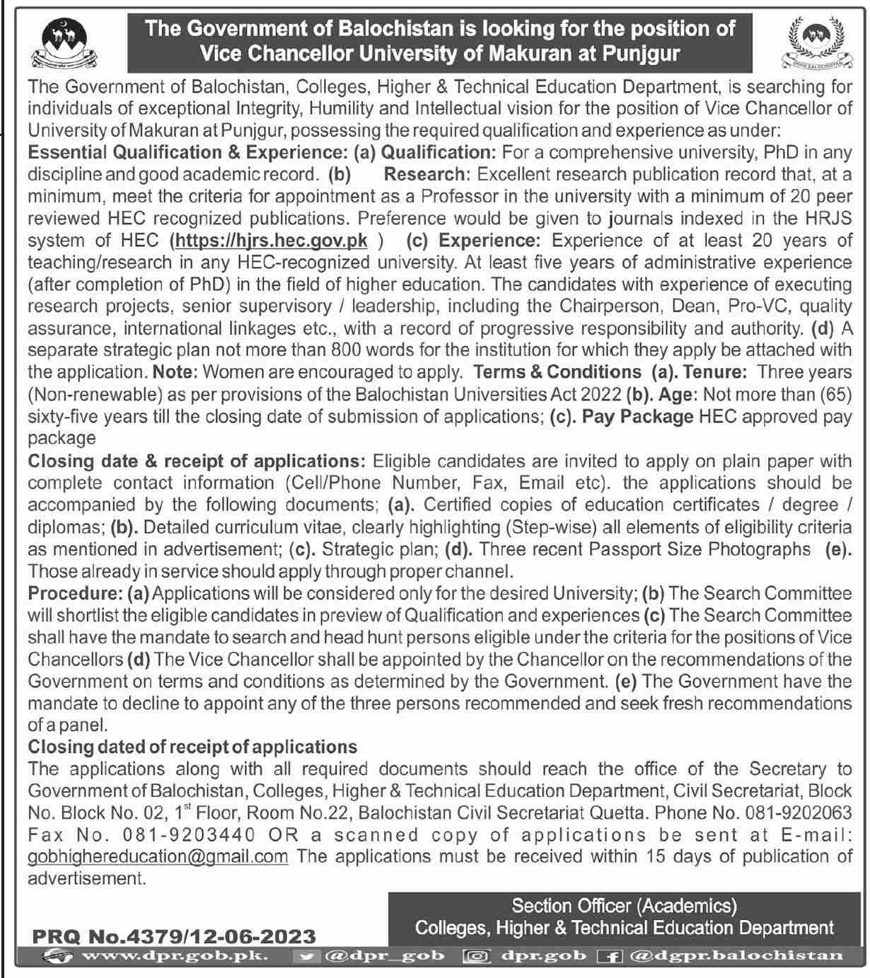 The Colleges Higher and Technical Education Department is looking for candidates for following posts as per job advertisement published in daily Dawn Newspaper of June 14, 2023 for location Makran, makran Balochistan Pakistan: