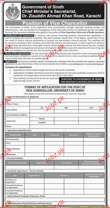 Vice Chancellors are required in Government of Sindh in Karachi.