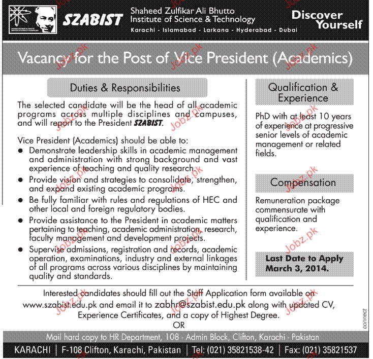 Vice President Academic Job In SZABIST