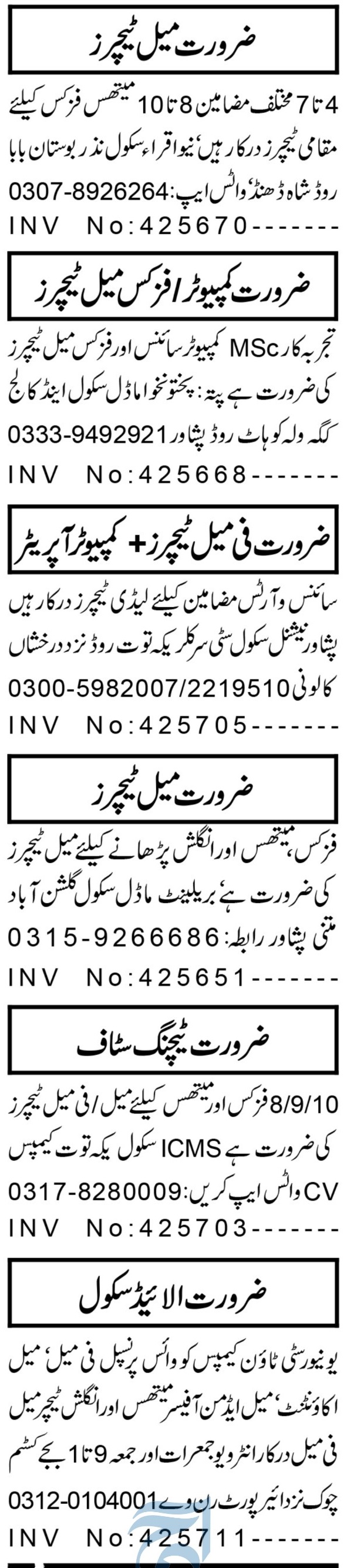 Private School is looking for candidates for following posts as per job advertisement published in daily Aaj Newspaper of October 18, 2023 for location Peshawar, peshawar Khyber Pakhtunkhwa KPK Pakistan:
