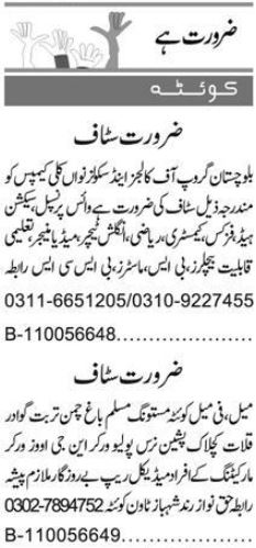 Private Sector jobs advertisement dated about 14 February 2024 in daily Express Newspaper invites application for the vacant post of polio worker, physics teacher, vice principal, english teacher, chemistry teacher, nurse, marketing staff, maths teacher, section head and media manager in Quetta, quetta Balochistan Pakistan. Candidates with Bachelor, Intermediate and Master etc. educational background will be preferred.