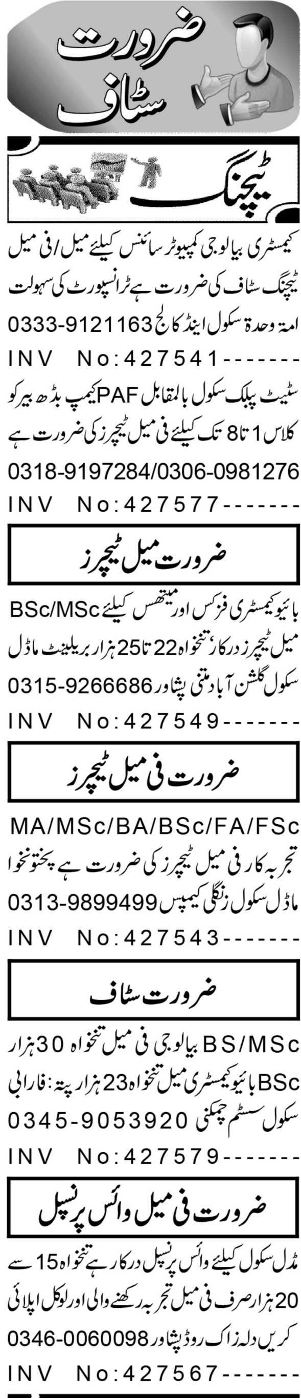 Vacant posts including computer science teacher, teacher, chemistry teacher, mathematics teacher, teaching staff, biology teacher, female teacher, physics teacher and vice principal are announced in Private School Peshawar, peshawar Khyber Pakhtunkhwa KPK Pakistan as per 20 December 2023 advertisement in daily Aaj Newspaper. Persons with BA, Intermediate, M.sc, B.ed, Master, Bachelor and MA etc. education can apply.
