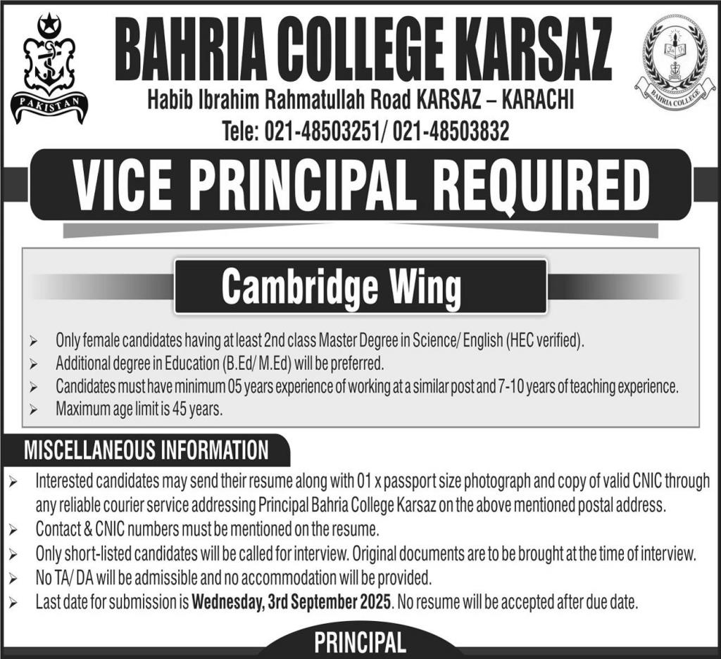 Bahria College invites applications for job positions advertised in daily Express dated 24 August 2025 for following vacancies in Karsaz Karachi, karachi Sindh Pakistan.