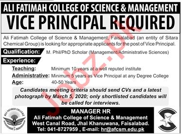 Latest Ali Fatimah College of Science & Management Teaching Posts Faisalabad 2025