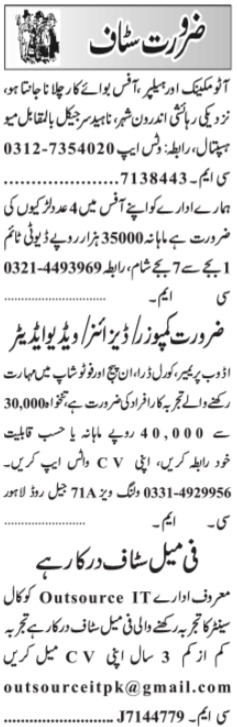 Private Company is looking for candidates for following posts as per job advertisement published in daily Jang Newspaper of April 24, 2024 for location Lahore, lahore Punjab Pakistan: