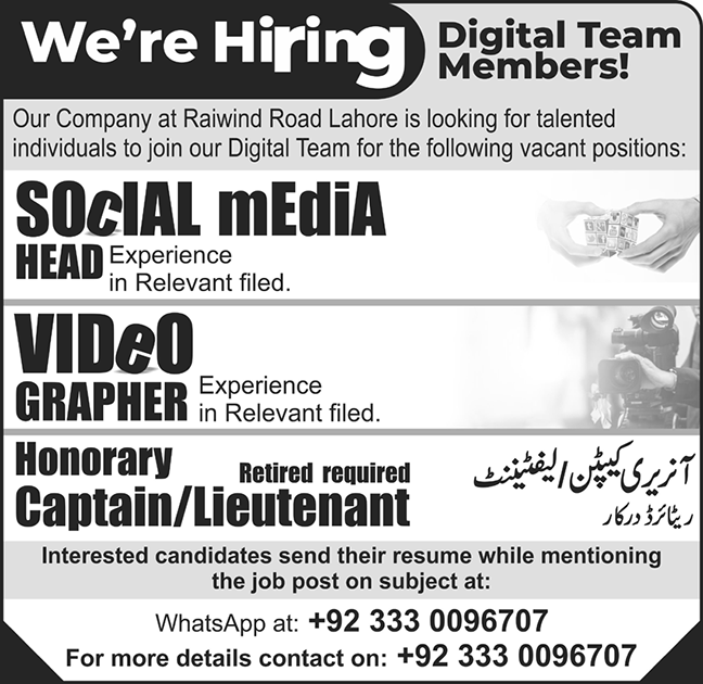 Private Company Lahore, lahore Punjab Pakistan invites applications from eligible candidates for the post of social media head, video grapher, honorary lieutenant and honorary captain as per advertisement of February 8, 2025 published in daily Nawaiwaqt Newspaper. Persons with Intermediate, BA and Bachelor etc. education can apply.