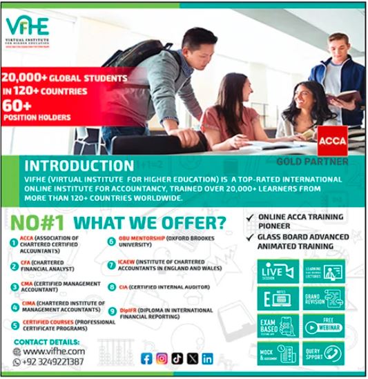 Virtual Institute For Higher Education VIFHE ACCA, CFA, ICAEW, CMA, CIMA, CIA, Certified Courses admissions 2024 has been announced. Virtual Institute For Higher Education VIFHE Karachi Sindh Pakistan welcomes students to apply for admissions in academic year 2024 in Management University. Eligible students for fulfilling criteria for admissions in Course and ACCA can enroll as per Private admission policy 2024 till closing date 30 June 2024. Read newspaper ad for exact details.