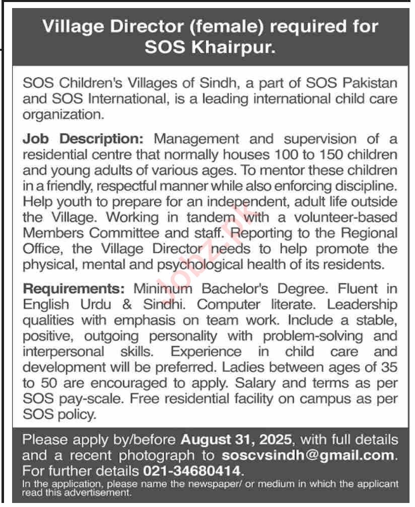 Vacant posts including village director are announced in SOS Children Village of Pakistan Khairpur, khairpur Sindh Pakistan as per 24 August 2025 advertisement in daily Dawn Newspaper. Persons with Master and Bachelor etc. education can apply.