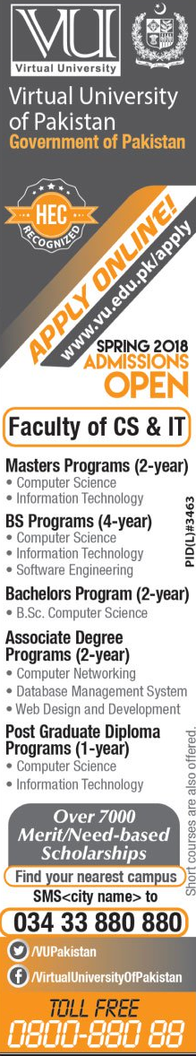 Virtual University of Pakistan Admission in MS, BS Computer Sciences, Information Technology, Information Technology, BSc Computer Sciences and Associate Degree Programs in Lahore. Read newspaper ad for exact details.