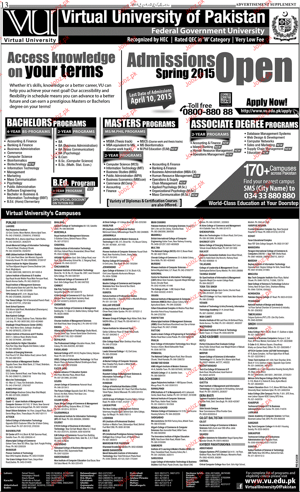 Virtual University of Pakistan Admission in BA, MA and Mphil in karachi. Read newspaper ad for exact details.