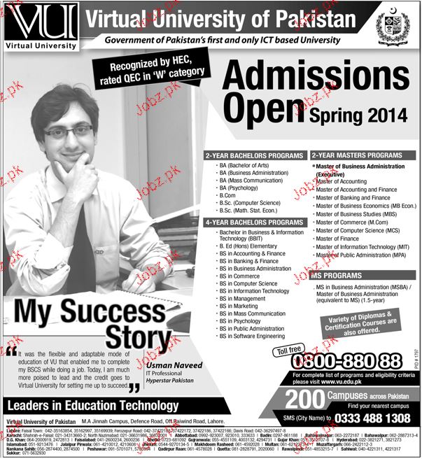 Virtual University of Pakistan Admission in BBA, BA, BS and MA in Lahore Read newspaper ad for exact details.
