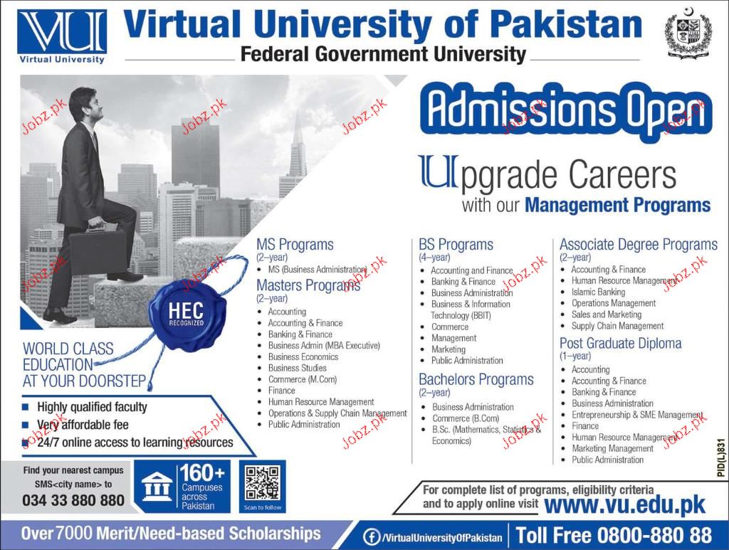 Virtual University of Pakistan Admission in BS and MS in Lahore. Read newspaper ad for exact details.